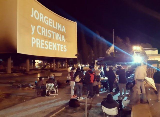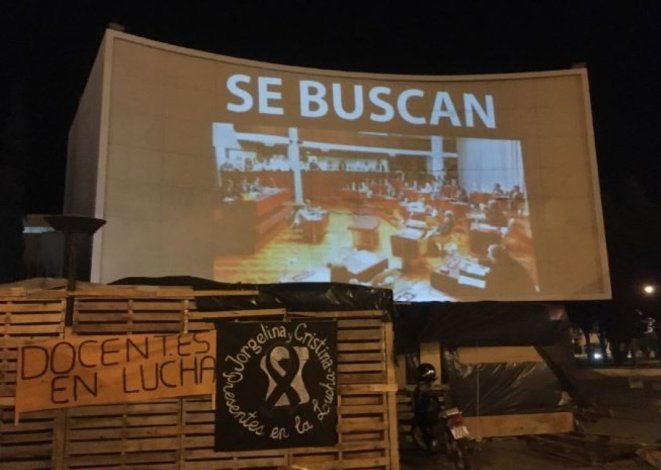 El ingreso a la Legislatura sigue negro de hollín, anoche en el segundo día de acampe se vivieron momentos muy emotivos cuando se proyectó en el frente de la Legislatura los nombres de las maestras de Comodoro Rivadavia que murieron en la ruta. “Jorgelina y María Cristina, PRESENTES”.