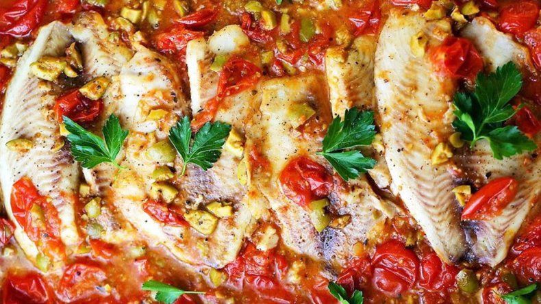 Colocaremos una sartén grande a fuego medio, incorporaremos el aceite de oliva y dejaremos calentar, una vez caliente agregaremos los dientes de ajo trozados y sellaremos ligeramente el abadejo. Una vez sellado, retiraremos y reservaremos. En la misma sartén incorporaremos las aceitunas y los tomates cherry, dejaremos cocinar cubierto por unos minutos, luego agregaremos el abadejo y cubriremos con el queso parmesano rallado. Dejaremos cocinar los últimos quince minutos, cubierto. Trascurrido el tiempo salpimentaremos bien, agregaremos el perejil picado y el orégano y serviremos acompañando con la salsa.