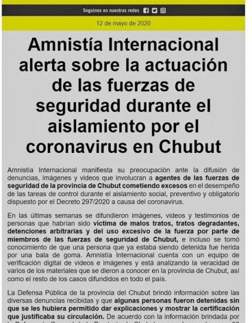 Frente a esta situación en contacto con la Defenstoría del Chubut comenzó Amnistía a involucrarse. “El organismo cuenta con una plataforma de chequeo de material de video, se confirma el uso de armas, filmaciones con abuso, etc”, explicó.