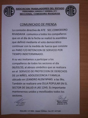 Esta tarde, los trabajadores de ATE Comodoro definieron en asamblea la continuidad de paro o retención de servicios por tiempo indeterminado. El reclamo del sector apunta a la falta del pago de haberes correspondientes al mes de febrero, falta de pago de enero para el 3 y 4 rango y el rechazo a la discriminación hacia los trabajadores priorizando a algunos sectores, en referencia al pago exclusivo a legislativos.