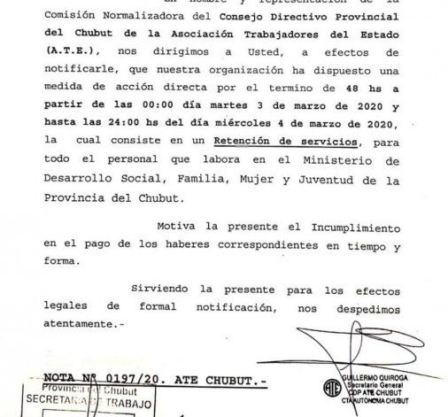 Con una notificación al secretario de Trabajo de la Provincia del Chubut, Cristian Ayala se informó una medida de acción directa desde las 00:00 horas del martes 3 de marzo hasta el miércoles a las 24 horas del miércoles 4 de marzo.