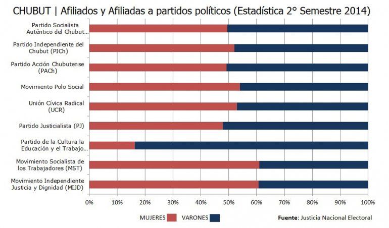 En Chubut hay más mujeres afiliadas a partidos políticos que varones. Sin embargo, esta característica no queda traducida en las listas para cargos provinciales donde hoy su representación –en la mayoría de los casos- queda relegada al segundo lugar, siempre como vice o acompañante de un varón.