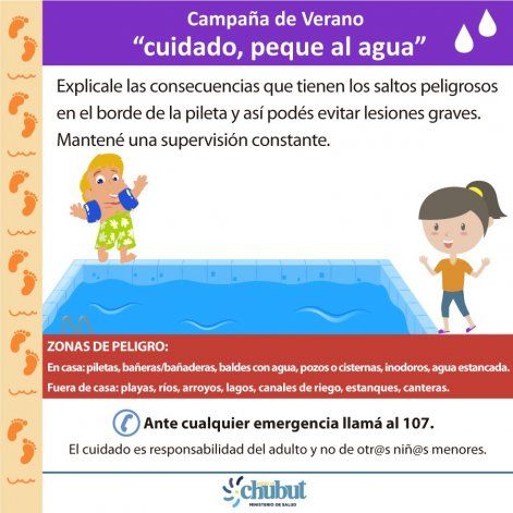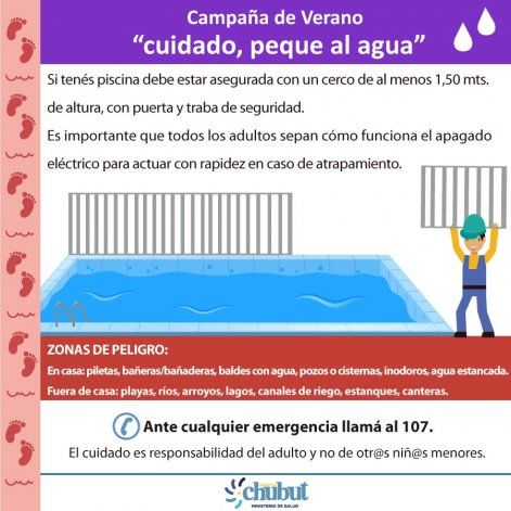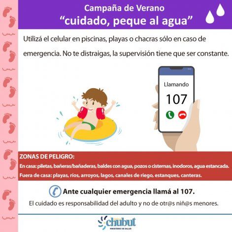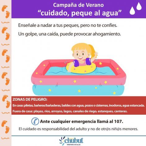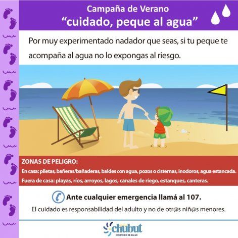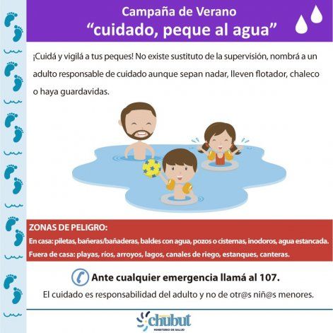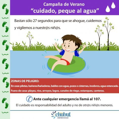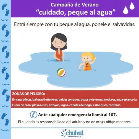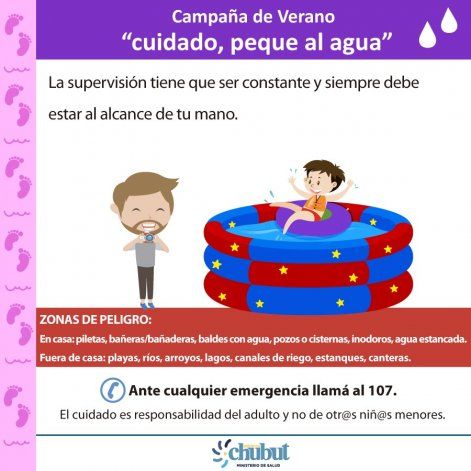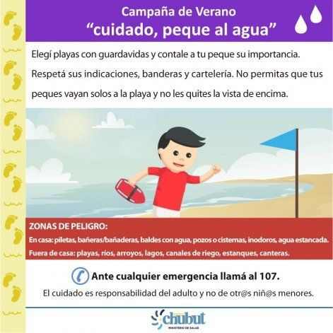 Con el objetivo de asegurar el disfrute de las familias durante el período estival, el Ministerio de Salud del Chubut, a través de la Dirección Provincial de Maternidad, Infancia y Adolescencia, se encuentra realizando en redes sociales la Campaña de Verano “Cuidado, peque al agua”, que pretende concientizar a los adultos sobre la importancia de mantener siempre el cuidado y la vigilancia sobre las actividades que realizan los menores de edad, sobre todo cuando en las inmediaciones se observa la presencia de superficies de agua.