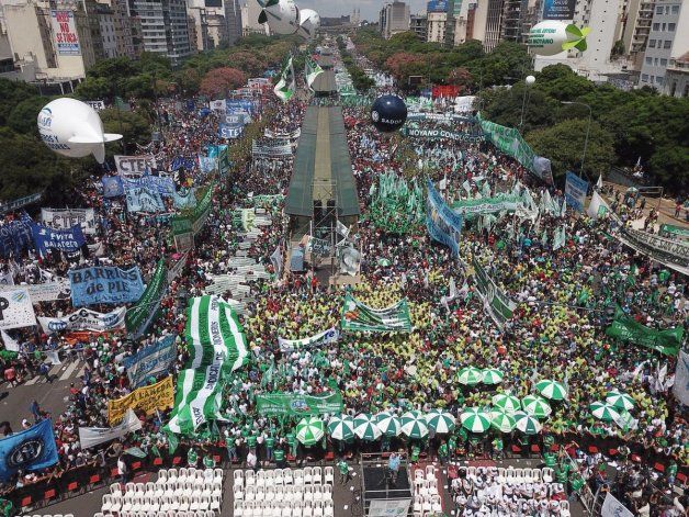 Con una masiva movilización que copó la avenida 9 de Julio, el camionero Hugo Moyano, junto a las dos CTA, ATE, la CTEP y partidos opositores como el kirchnerismo y la izquierda, lanzaron fuertes críticas a la política económica del Gobierno, y cuestionaron la intención de ponerle un tope a los aumentos salariales, la rebaja de las jubilaciones, el ajuste, y el proyecto de reforma laboral.