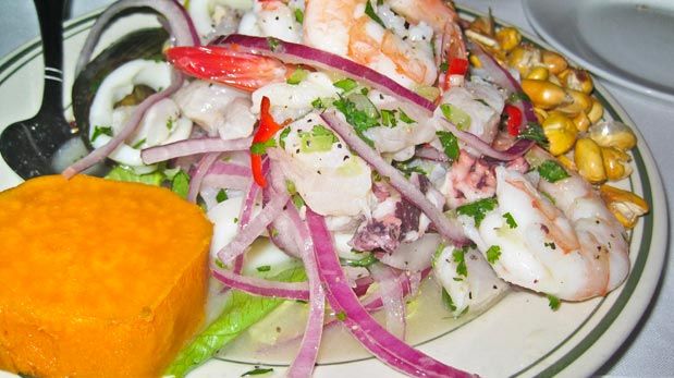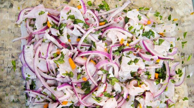A este ceviche se le llama ceviche mixto. Para servir se puede decorar con granos de maíz amarillo, cilantro picado, y rodajas de limón o lima.