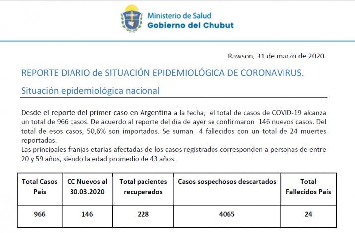El Ministerio de Salud provincial informó este mediodía que el total de personas aisladas en todo el territorio es de 1646; es decir 77 menos que el lunes. Sin embargo aumentó el número de casos sospechosos con nexo epidemiológico, que de 11 pasaron a 13. De ellos, hay 6 en Comodoro.