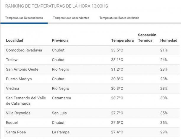 Según informó el Sistema Meteorológico Nacional a las 11 horas Comodoro Rivadavia es la ciudad más calurosa del país con 33.5 grados, mientras que en segundo lugar se ubica Trelew con 33.1.