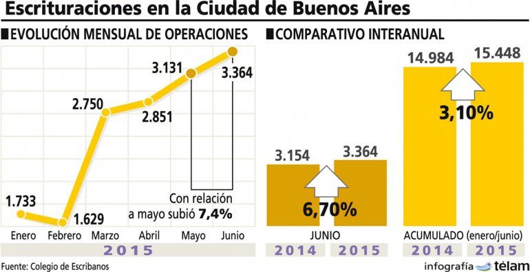 Las operaciones de compraventa de inmuebles en la Ciudad de Buenos Aires alcanzaron en junio 3.364 escrituras lo que representó un incremento del 6,7 por ciento interanual, y contribuyó a cerrar el primer semestre del año con un aumento de 3,1 por ciento en comparación con igual período de 2014, informó ayer el Colegio de Escribanos porteño.