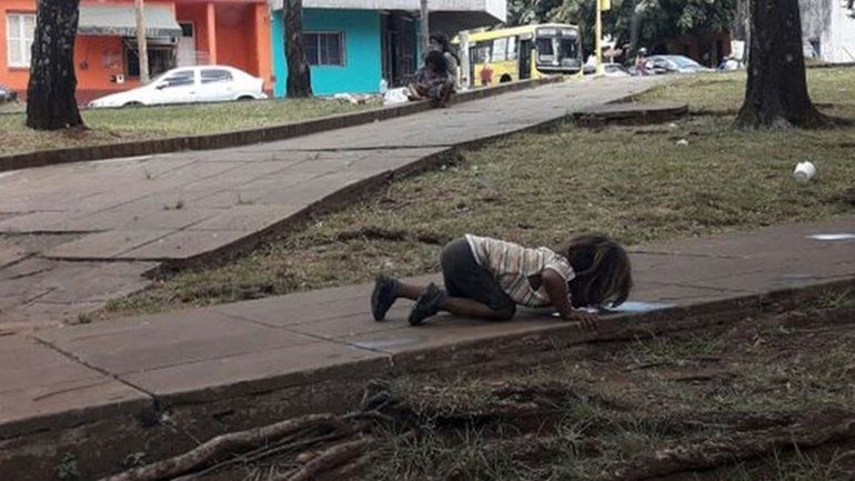 En la fotografía se ve cómo una niña de Misiones, perteneciente a la comunidad mbyá guaraní, se inclina sobre el charco de una plaza para beber agua en un día que se registraron 38 grados en la ciudad de Posadas. Tomada en horas del mediodía por una periodista del portal Misiones Online mientras circulaba en su auto por la avenida Mitre, la foto circuló entre sus colegas y llegó a las redes sociales.