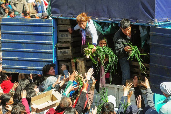Los trabajadores manifestaron que así como pagan el alquiler, podrían abonar un crédito y avanzar en "dignidad, arraigo y una mejor calidad de vida para nuestras familias", según decían a la gente que se agolpó y en oportunidades se subían a los camiones para obtener alguna verdura.