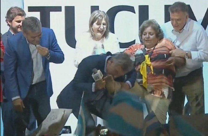 "¡Te amo, te amo, sos la Patria!", le dijo Manuela a Macri. Tras el intercambio, el Presidente se agachó y le besó el pie a la señora: "Encontré mi cenicienta, ahora tengo hechicera y cenicienta", bromeó.