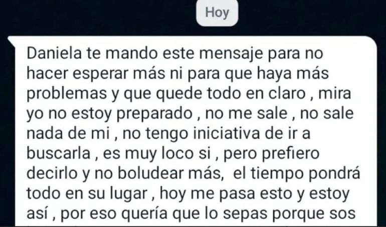 En el mismo mensaje enviado, el hombre había anticipado: “Dirás qué hijo de puta, qué mal padre”, asegurando que quería “ir con la verdad” acerca de lo que le está sucediendo, y, por si fuera poco, dejó en claro: “Si algún día nos cruzamos no existo, no existimos”.