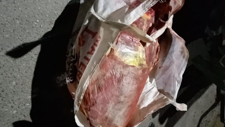 Al inspeccionar el interior de la cúpula del rodado, los policías hallaron siete envoltorios de bolsa tipo arpillera de arena color blanco, que contenían carne de equino, específicamente una paleta, un costillar y dos cuartos traseros. Además, se encontraron siete vainas servidas y dos municiones calibre punto 223, un cuchillo con funda marrón y una chaira.