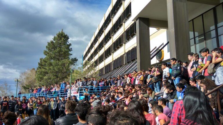 Desde las 14 horas estudiantes de todas las Facultades que componen la Universidad de la Patagonia San Juan Bosco se congregaron en las escalinatas de ingreso del edifico de Km 4 con el objetivo de planificar los pasos del plan de lucha que buscan confluir con la marcha nacional el próximo jueves.