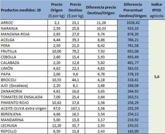 Tal es el caso del arroz, donde la diferencia entre el precio de origen y destino fue de 11,26 veces ($ 2,1 por kilo al productor – $ 23,1 por kilo en góndola); lo siguió la naranja, con una brecha de 10,33 veces ($ 2,50 – $ 25,8) provocada por el ajuste en los precios pagados al productor; la manzana roja, con una diferencia de 9,74 veces ($ 2,85 – $ 27,8); la acelga, con una brecha de 8,86 veces ($ 4,44 – $ 39,3); la pera, con una disparidad de precios de 8,42 veces ($ 2,50 - $ 21) y la frutilla, con una distancia entre los valores de 7,92 veces ($ 10 – $ 79,2).