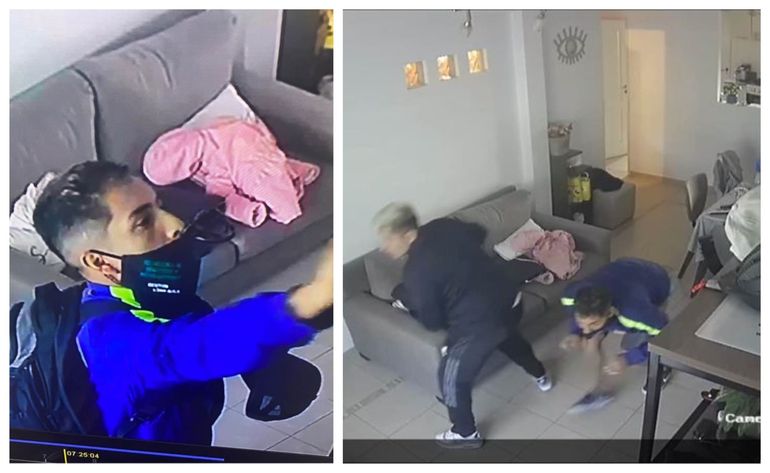 Salió de su casa alrededor de las 7.25, dejando a su hijo de 13 años durmiendo en la planta alta. Al regresar, unos 10 minutos más tarde, percibe algo extraño por lo que detiene la marcha de su vehículo y empieza a observar las cámaras ubicadas en su domicilio, a través de su teléfono celular, observando que dos hombres se encontraban en el interior.