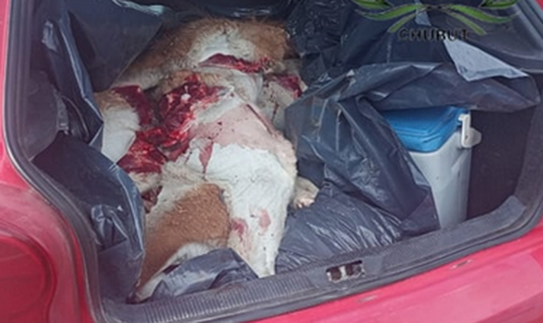 Con la presencia de un testigo, se procedió a abrir el baúl del automóvil, donde se encontraron restos de entre cuatro y cinco guanacos, identificables por la cantidad de cuartos y paletas. Los dos hombres fueron detenidos y trasladados junto con el vehículo, el arma y los restos de los animales. Asimismo, se solicitó la intervención del personal del Servicio Nacional de Sanidad y Calidad Agroalimentaria (SENASA) para llevar adelante el procedimiento correspondiente.