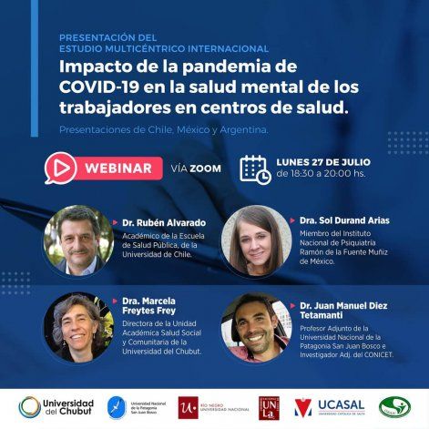 Científicos de la Universidad Nacional de la Patagonia San Juan Bosco y la provincial Universidad del Chubut, representarán a nuestro país en el webinar internacional para la presentación del "Impacto de la pandemia de COVID-19 en la salud mental de los trabajadores en centros de salud. Estudio internacional multicéntrico".