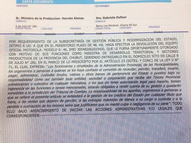 El pasado 19 de diciembre, portales nacionales se hicieron eco de la carta documento enviada a la ex ministra de Desarrollo Territorial y Sectores Productivos y actual diputada provincial del Frente Para la Victoria, Gabriela Dufour. La misiva exigía a la funcionaria saliente que devuelva "el celular de última generación E46".