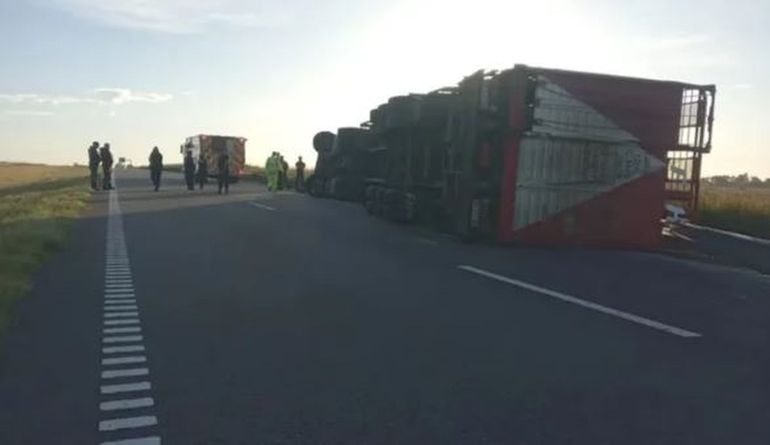 Por motivos que permanecen bajo investigación judicial, el conductor perdió el control cuando circulaba por la Ruta 8, el camión despistó, volcó y quedó atravesado parcialmente sobre la cinta asfáltica y la banquina.