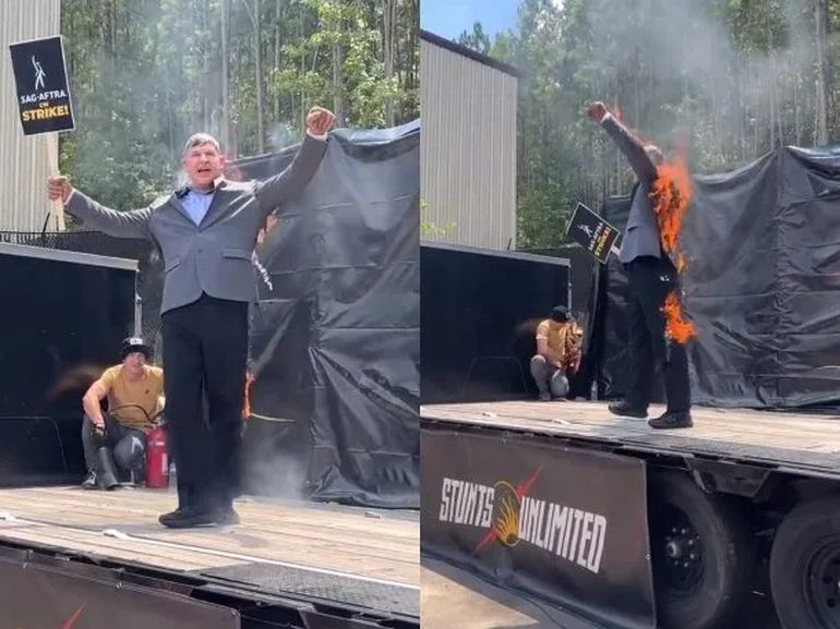 El veterano doble de acción y miembro de la Unión de Actores, Mike Massa, que recientemente fue el doble de acción de Harrison Ford en Indiana Jones y el Dial del Destino, se prendió fuego a sí mismo en una manifestación en Atlanta durante la huelga de actores en Hollywood mientras sujetaba un cartel que se podía leer "SAG-AFTRA en Huelga".