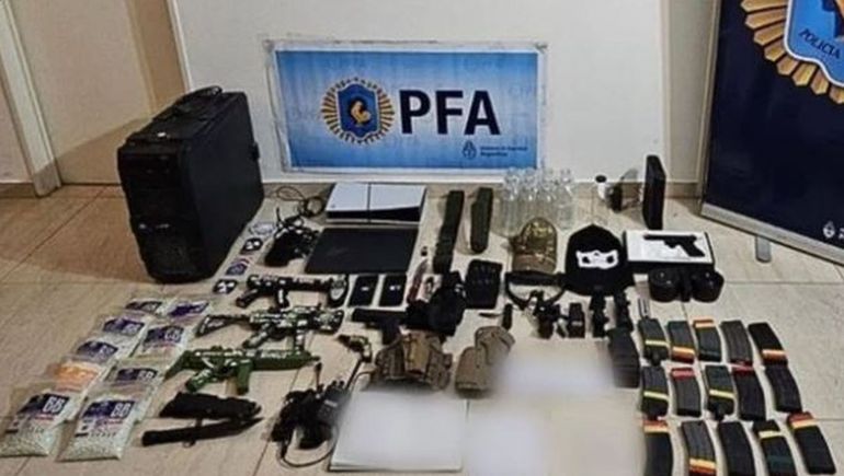 Con la orden de la jueza María Romilda Servini, la PFA allanó el domicilio y secuestró un arsenal de elementos: varias réplicas de armas de fuego (pistolas, un revólver y un subfusil); dos cuchillos, municiones, gas pimienta y botellas tipo "molotov", y una carta de despedida ante un posible suicidio.