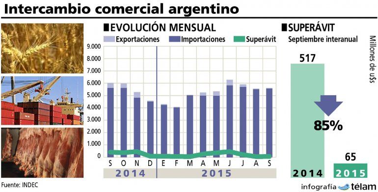En su informe, el organismo precisó que durante setiembre las exportaciones cayeron en términos interanuales un 7 por ciento para quedar en 5.611 millones de dólares, al tiempo que las importaciones avanzaron un 1 por ciento para quedar en 5.546 millones de dólares.