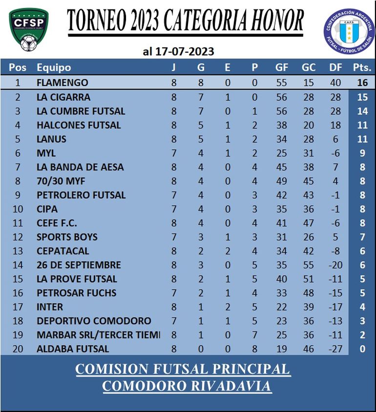 Mientras que por la séptima jornada, Petroleros Futsal venció 9-4 a Lanús, Marbar/Tercer Tiempo le ganó 3-1 a Deportivo Comodoro, Petrosar Fuchs derrotó 6-3 a Halcones Futsal, mientras que La Cigarra se impuso por 5-4 sobre Club Infantil Patagonia Argentina (CIPA).