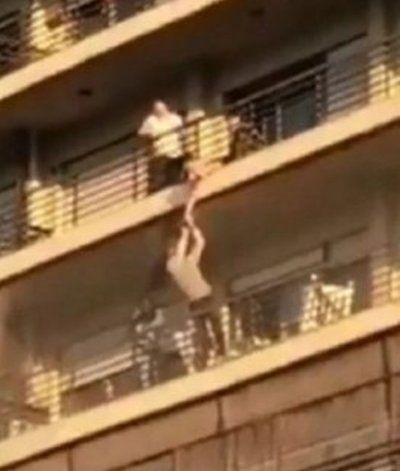 En el video se ve como dos personas intentan empujarlo de nuevo adentro, mientras desde el séptimo piso otra le sostiene las piernas y evita que se caiga al vacío. Luego, se ve a un cuarto hombre saltar barandas para llegar hasta el nene y agarrarlo.
