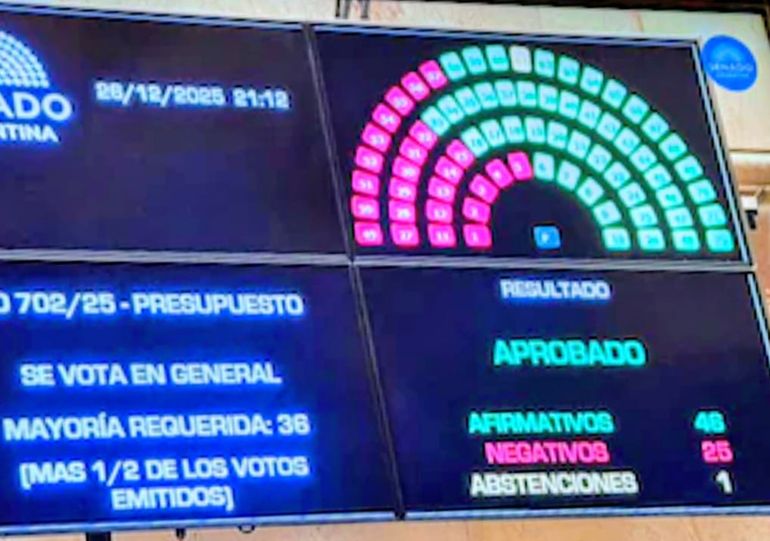 El Gobierno nacional consiguió firmar una victoria clave antes de que cierre el año. Este viernes por la noche le dio sanción en el Senado de la Nación al Proyecto de Presupuesto 2026 con 46 votos a favor, 25 en contra y una abstención. La semana pasada, ya había tenido media sanción en Diputados.