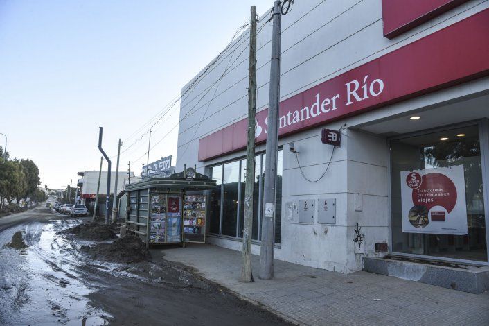 La gran cantidad de barro en el sector dejo fuera de servicio a los cajeros del banco Santander Rio y en las sucursales del banco Galicia y Macro funcionan con normalidad pero su acceso está complicado sobre todo por la Yrigoyen está habilitada para el paso de pocos vehículos.