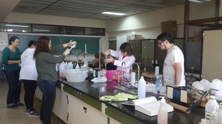 En la Universidad Nacional de la Patagonia San Juan Bosco, alrededor de 15 docentes de las carreras Farmacia y Bioquímica, se turnan desde hace varios días para elaborar y envasar alcohol en gel, para abastecer a los centros de salud y hospitales de la ciudad.
