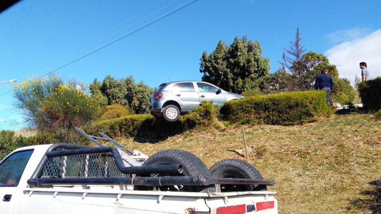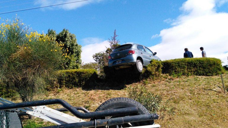 Por razones que se tratan de establecer un Volkswagen Gol quedó colgado de unos arbustos, después de una mala maniobra.