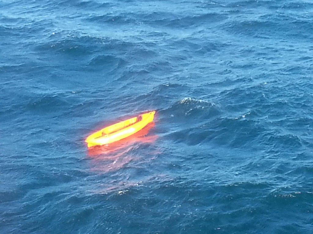 El kayak de color naranja fue hallado en la zona de Bahía Bustamante, divisado desde el barco “Don Corrado”, en línea recta con el Faro Aristizabal, a unos 15 kilómetros de la costa, según informaron fuentes de Prefectura Naval.