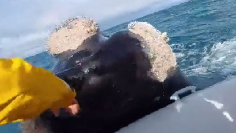 El hecho ocurrió en las costas de kilómetro 3, donde un grupo de personas que realizaba un curso de timonel se encontró con una ballena que se posó sobre la embarcación. En las imágenes se puede ver cómo el animal se acerca al bote y lo toca con su cabeza, mientras las personas se asombran y se asustan por la situación.