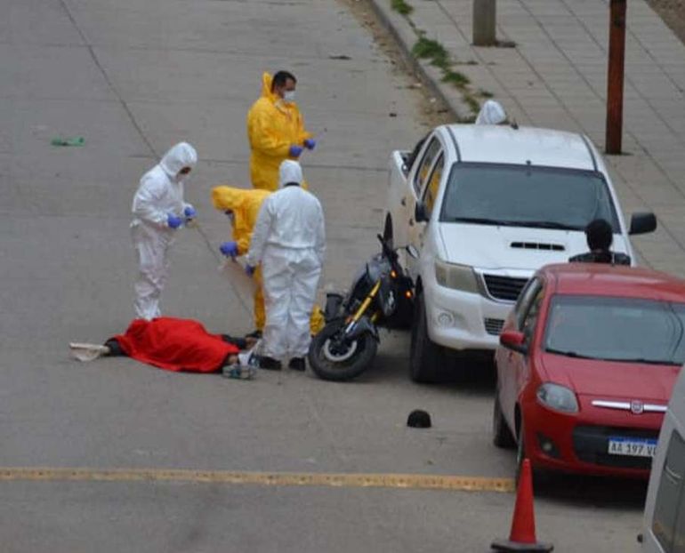 La víctima fatal fue identificada como Ulises Olima, quien era el que conducía la moto y que, tras ser herido de muerte, avanzó de manera errática por casi cien metros hasta que la apoyó contra el lateral de una camioneta estacionada, para luego caer al suelo.