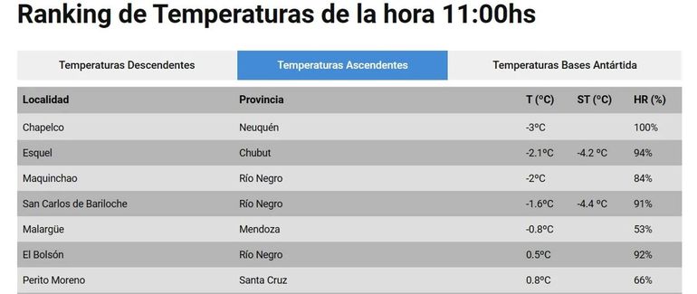El primer lugar de la tabla lo ocupaba Chapelco en Neuquén, mientras que el tercer lugar era para Maquinchao y Bariloche, en la provincia de Río Negro.