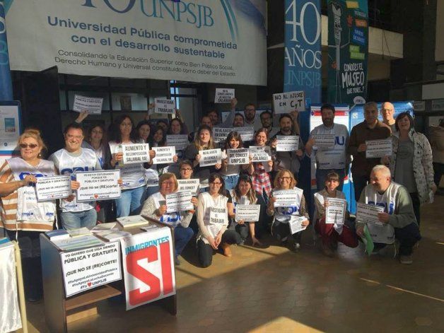 Bajo el lema “Ciencia con viento en contra. Sin ciencia y tecnología no hay futuro” , los docentes universitarios de Comodoro Rivadavia se reunieron en el hall de la sede de la Universidad de la Patagonia San Juan Bosco, ubicada en km 4.