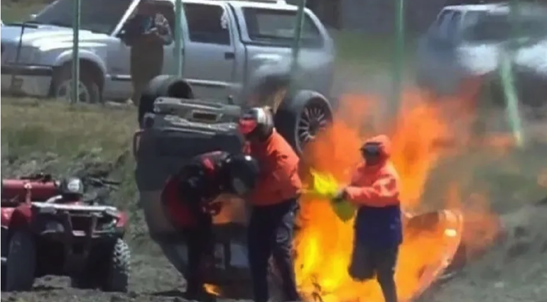 El piloto Franco Angaramo sufrió este sábado en el autódromo Ciudad de Viedma un terrible accidente durante la carrera de la final de la Copa Abarth. El auto del misionero volcó, rodó y posteriormente explotó luego de un gran trabajo de los rescatistas al sacar al conductor a tiempo, quien se encuentra en buenas condiciones.