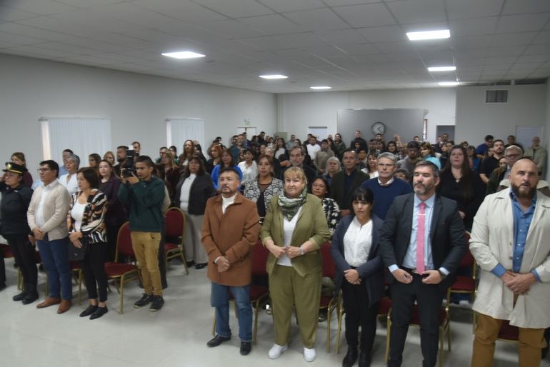 El acto contó con la presencia de una delegación de funcionarios de la municipalidad de Caleta Olivia encabezados por el jefe de gabinete, Mariano Mazzaglia y la presidenta de la Comisión de Fomento de Jaramillo y Fitz Roy, Ana María Urricelqui.