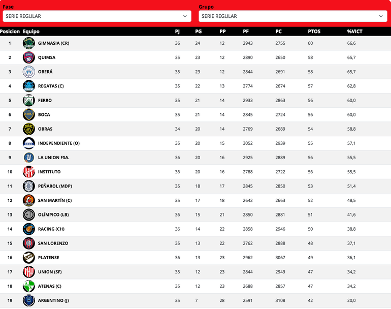 La “Fusión” visitará a Independiente de Oliva, mientras que el “Celeste” recibirá a Atenas de Córdoba, que busca evitar el playout. Si Quimsa y Oberá caen en sus respectivos compromisos, entonces el equipo de Pablo Favarel se quedará con el 1 de la fase regular y por primera vez en la historia del club.
