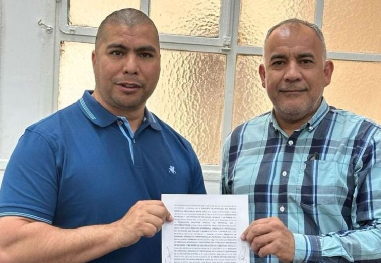 Guenchenén (a la izquierda de la fotografía) celebró el acuerdo junto a otro dirigente, indicando que dicha suma se calculará sobre todo los conceptos y se adicionará a las sumas no remunerativas ya acordadas.