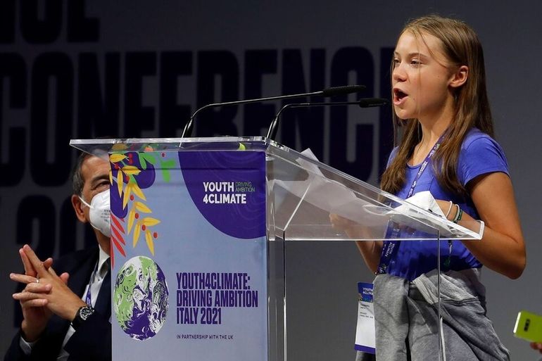 "No hay un planeta B, no hay planeta bla bla, bla bla bla, bla bla bla, economía verde bla bla, neutralidad de carbono para 2050 bla bla", enfatizó bajo los aplausos de 400 jóvenes de todo el mundo reunidos en Milán por iniciativa de la ONU, un mes antes de la conferencia climática COP26.