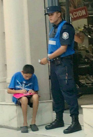 La imagen fue tomada en la ciudad Paraná, Entre Ríos y se viralizó en poco tiempo, por la buena acción del policía de 20 años que decidió dedicarle un momento a Pablo, un niño de 12 años que no sabe leer ni escribir. Cristian Irigoitía contó a los medios paranaenses cómo sucedieron los hechos.
