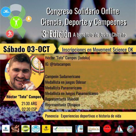El 3° Congreso Solidario Online de Ciencia, Deportes y Campeones será el sábado 3 de octubre (8:30 a 22:30), a beneficio del profesor de educación física Javier Chiarito, quien se encuentra en Rosario recibiendo un tratamiento oncológico, con evolución favorable.