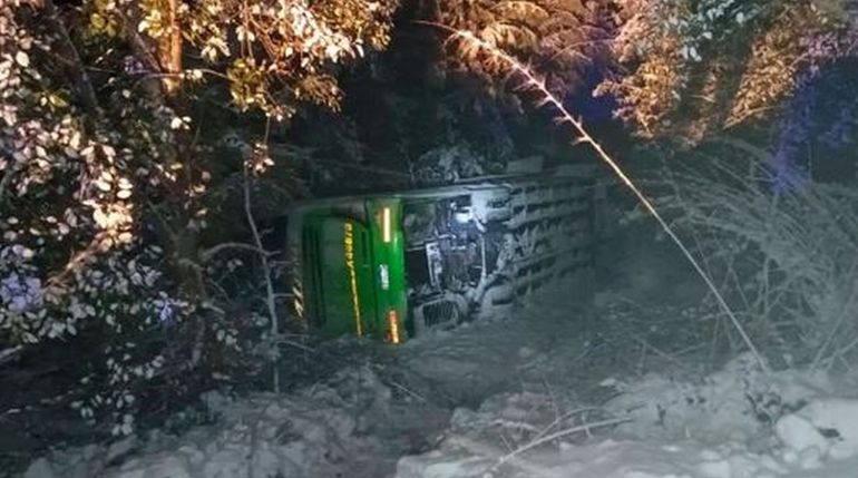 El hecho ocurrió el martes cerca de las 23 apenas a mil metros del puente de Ruca Malen, ubicado en el km 2.134 de la Ruta de los Siete Lagos. En ese punto, por circunstancias que todavía se desconocen, un ómnibus volcó y quedó acostado a un lado sobre la vera de la ruta y en el medio de la nieve.