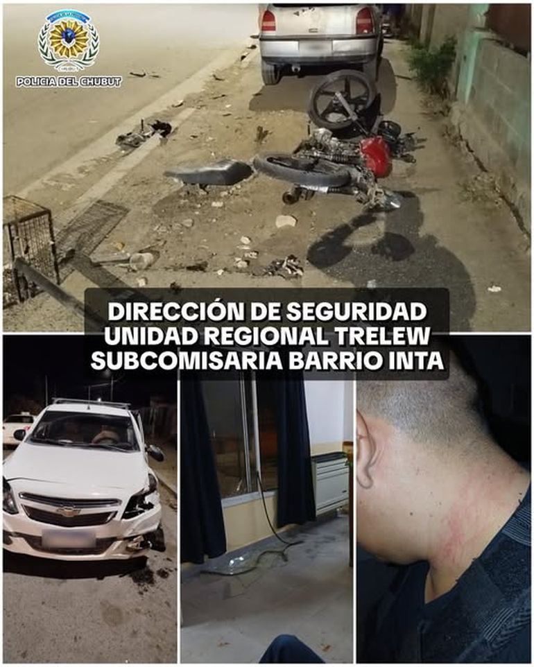 Un violento episodio se registró este viernes por la noche en el barrio INTA de Trelew, luego de un choque frontal entre un automóvil y una motocicleta que dejó como saldo un motociclista con una fractura expuesta en la pierna izquierda. El siniestro fue advertido por el personal de la Subcomisaría INTA, que escuchó el fuerte impacto y acudió de inmediato al lugar.
