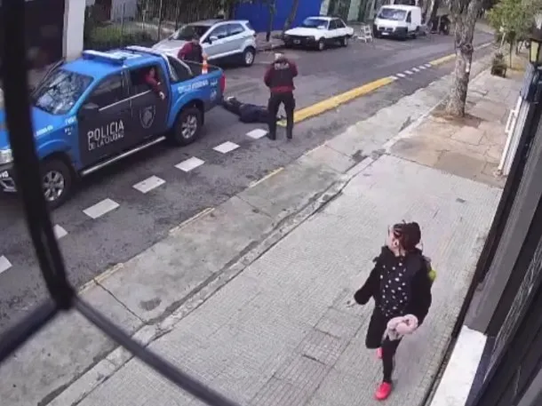 Pocos segundos después, se observa la llegada de un móvil de la Comisaría Vecinal 12 A, perteneciente a la División Despliegue Intervenciones Rápidas (DIR), cuyos ocupantes detienen la marcha, descienden con sus armas reglamentarias y disparan contra el agresor, que perseguía corriendo a su víctima.