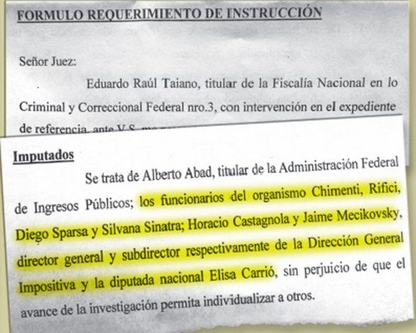 Mecikovsky (ya imputado por Taiano) declaró la semana pasada como testigo en el marco de la investigación por lavado de dinero que instruye el juez Sebastián Casanello y apuntó contra su ex jefe, Ricardo Echegaray, a quien señaló como parte de un sistema de protección contra Lázaro Báez, principal imputado y detenido en el marco de ese expediente. También señaló a Cristina de Kirchner y al ex ministro Julio De Vido, además de al ex jefe de Gabinete, Jorge Capitanich, quien salió al contraataque de su declaración. Taiano agregó a la "diputada nacional Elisa Carrió, sin perjuicio de que el avance de la investigación permita individualizar a otros".