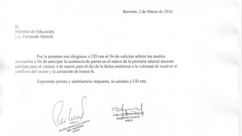 En tanto, desde el sector docente se apuró la audiencia conciliatoria para reabrir la discusión salarial y no el viernes, tal como está especificado en conciliación obligatoria emitida el viernes. Estefanía Aguirre, secretaria general de ATECh, confirmó en diálogo con El Patagónico que el pedido fue aceptado y que se convocó al gremio para mañana a las 10 de la mañana.